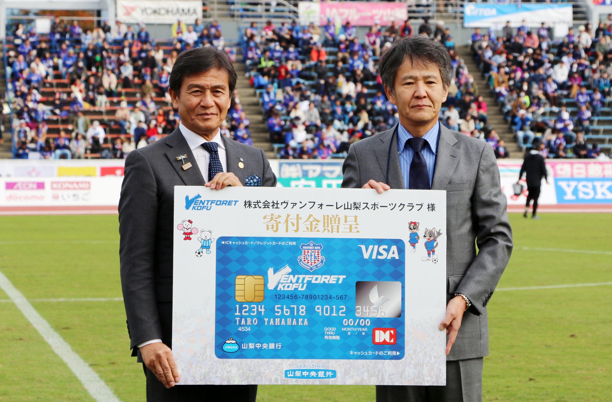 株式会社山梨中央銀行(頭取 古屋 賀章)は、11月10日(日)に開催された「ヴァンフォーレ甲府 VS 水戸ホーリーホック」戦において、ヴァンフォーレ甲府と提携したクレジットカード一体型キャッシュカード「JiMOCA VFK」のサービスの一環として、寄付金(455,343円)をヴァンフォーレ甲府に贈呈いたしました。