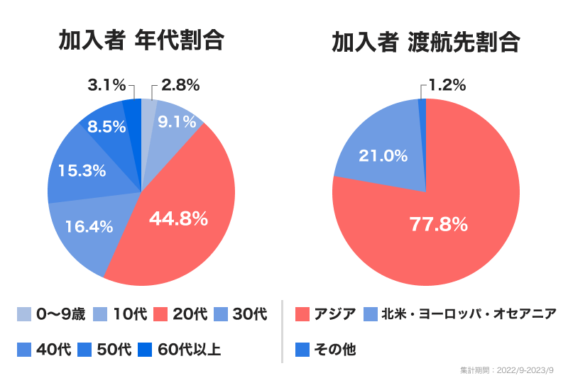 また、加入者の約半数が20代、渡航先はアジアが約8割を占めていることから、若者による近隣国への旅行の際に加入されるケースが多いことがわかりました。なお、3つの保険プランのうち最も補償が充実している「安心プラン」への加入が最も多く、保険料の安さよりも補償の充実度を優先するユーザーが多いようです。