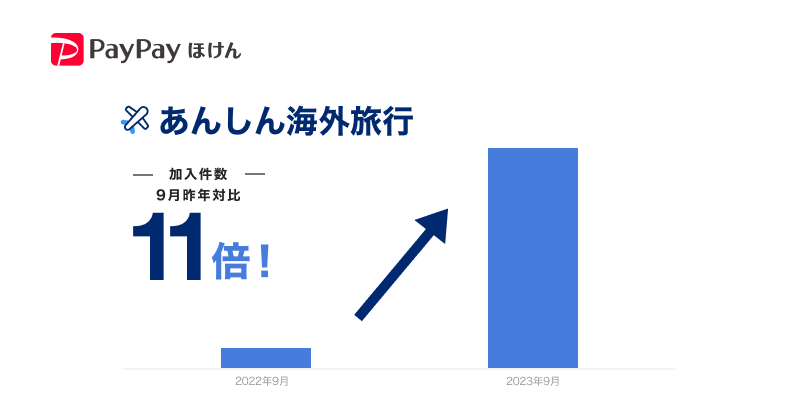 LINEヤフー株式会社(以下、LINEヤフー)とZフィナンシャル株式会社のグループ会社である、PayPay保険サービス株式会社(以下、PayPay保険サービス)が、PayPay株式会社(以下、PayPay)が提供するキャッシュレス決済サービス「PayPay」内のミニアプリ(※1)「PayPayほけん」で提供している海外旅行時におけるトラブルに備える保険「あんしん海外旅行」(以下、本保険)の9月における加入件数が、前年同期比で約11倍(※2)になりました。
