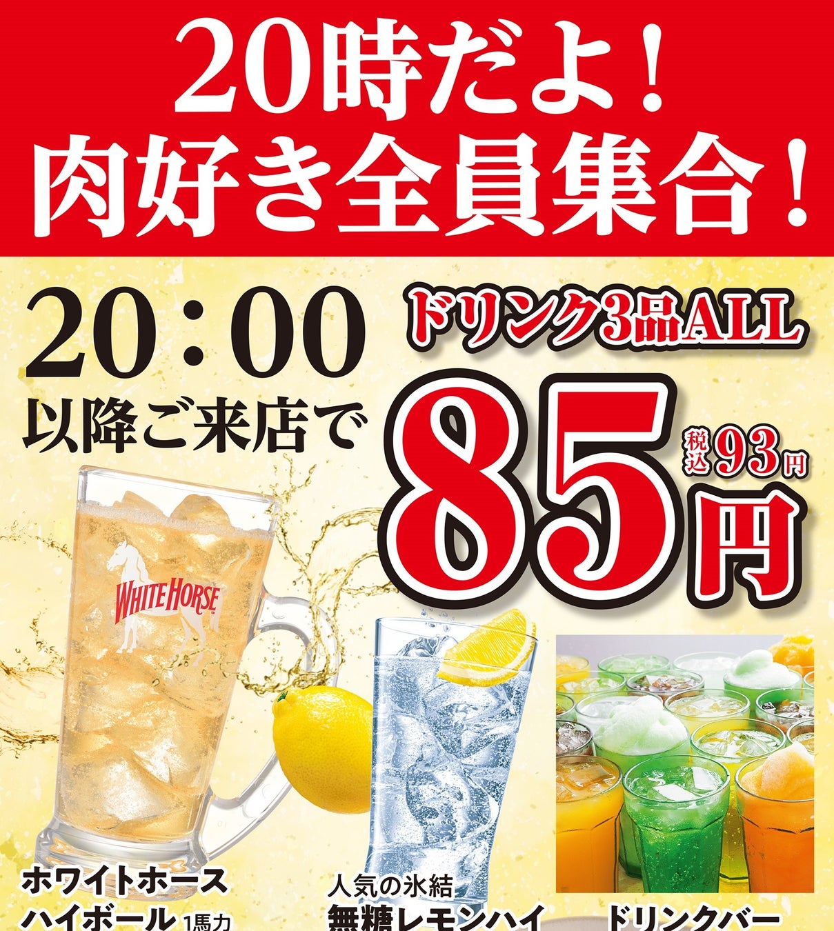 ※20時以降にご来店だと更にお得に ホワイトホースハイボール・無糖レモンハイ・ドリンクバーが【85円(税込93円)】になります。
