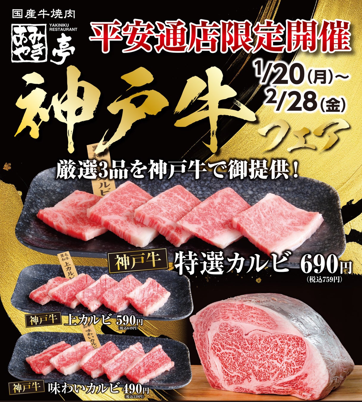 株式会社あみやき亭(本社:愛知県春日井市/代表取締役社長:宮崎 卓也)が中部地区に81店舗を展開する国産牛焼肉「あみやき亭」平安通店にて「神戸牛フェア」を開催致します。