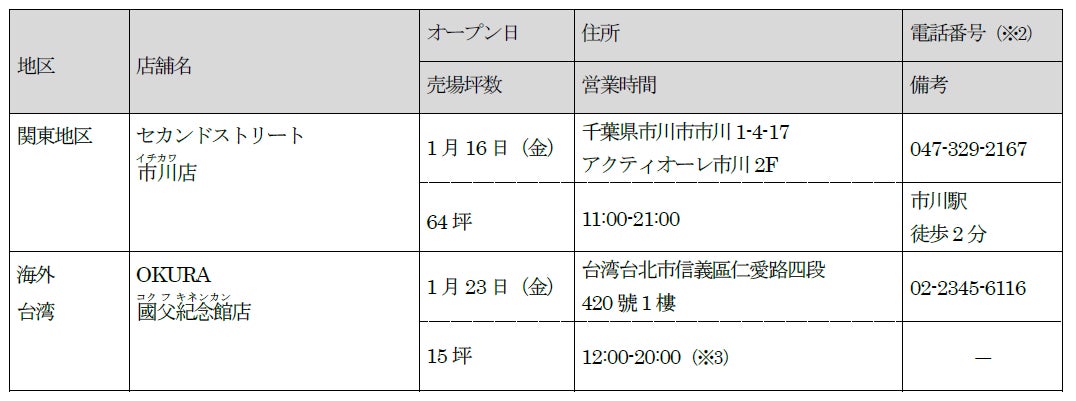 新たに、「セカンドストリート」1店舗、「OKURA」1店舗の合計2店舗が2026年1月度にオープンします。