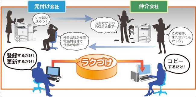 元付け会社は、これまで多くのコストをかけてFAX等で仲介会社各社と物件情報をやりとりしていましたが、「ラクづけ」を利用することにより、低コスト・短時間で全国1万店舗以上の『HOME'S』会員企業に物件情報を公開することができます。