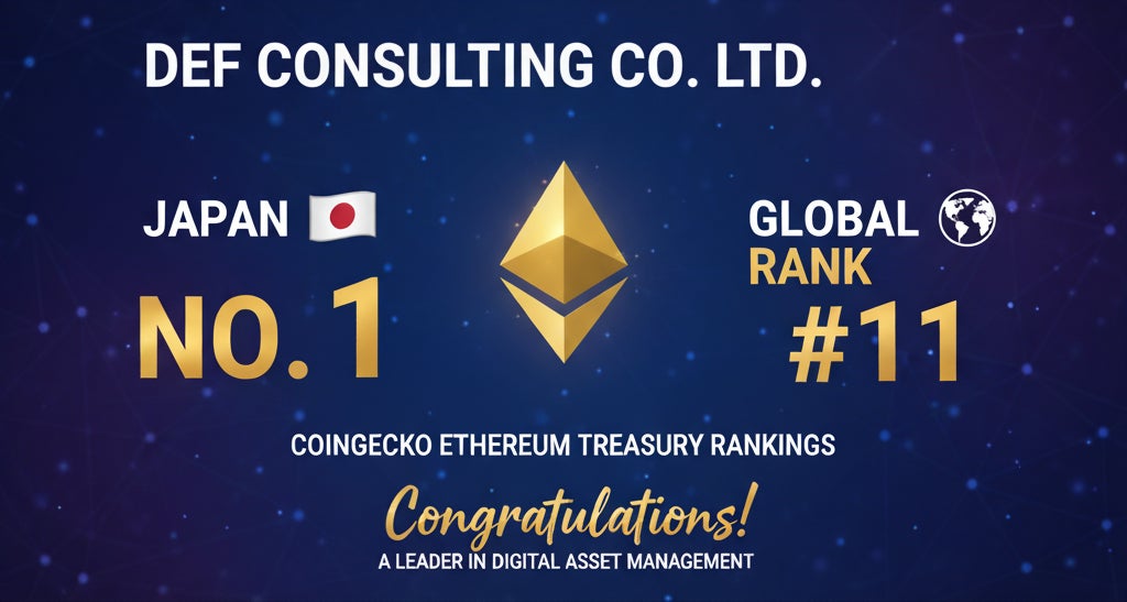 株式会社Def Consulting(本社:東京都港区、代表取締役社長:下村優太、証券コード:4833、以下「当社」)は、本日付けで、CoinGecko社(https://www.coingecko.com/ja)が発表した最新の「イーサリアムトレジャリーランキング」において、当社がイーサリアム(ETH)保有額で日本第1位、グローバル第11位にランクインいたしました。