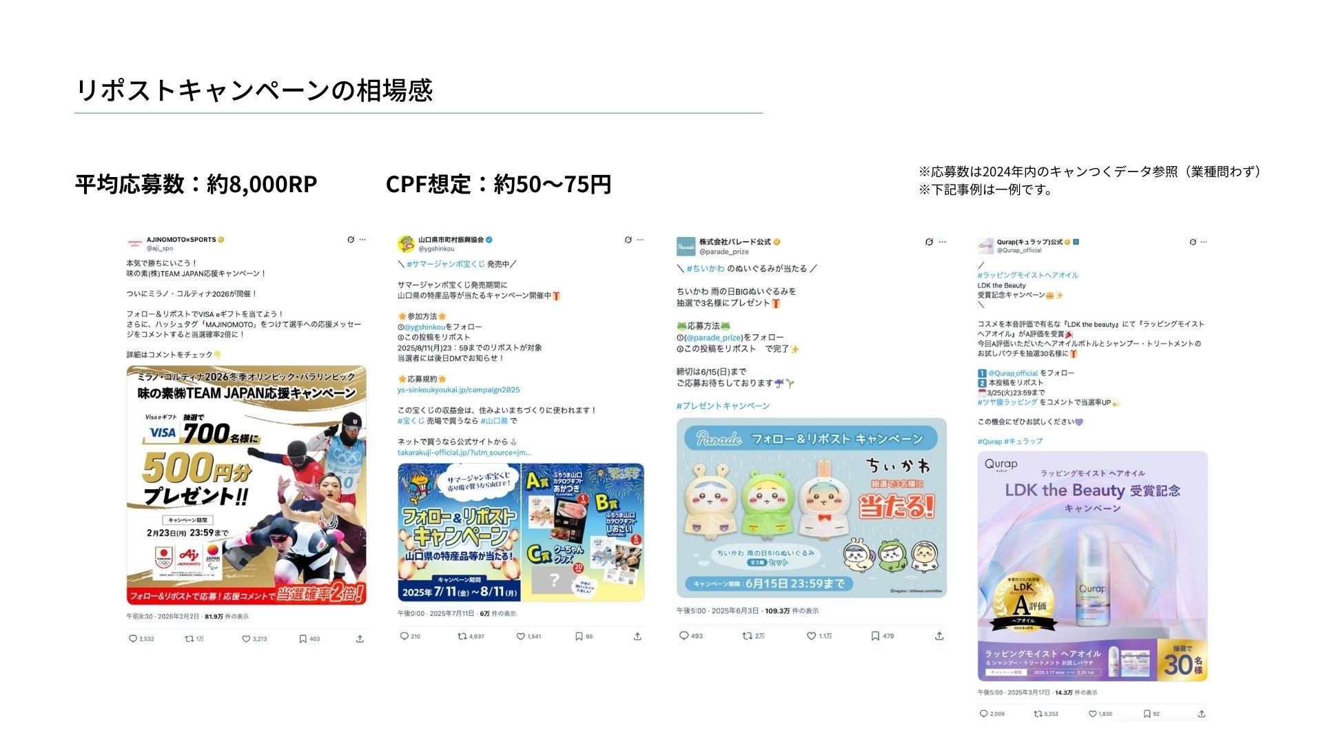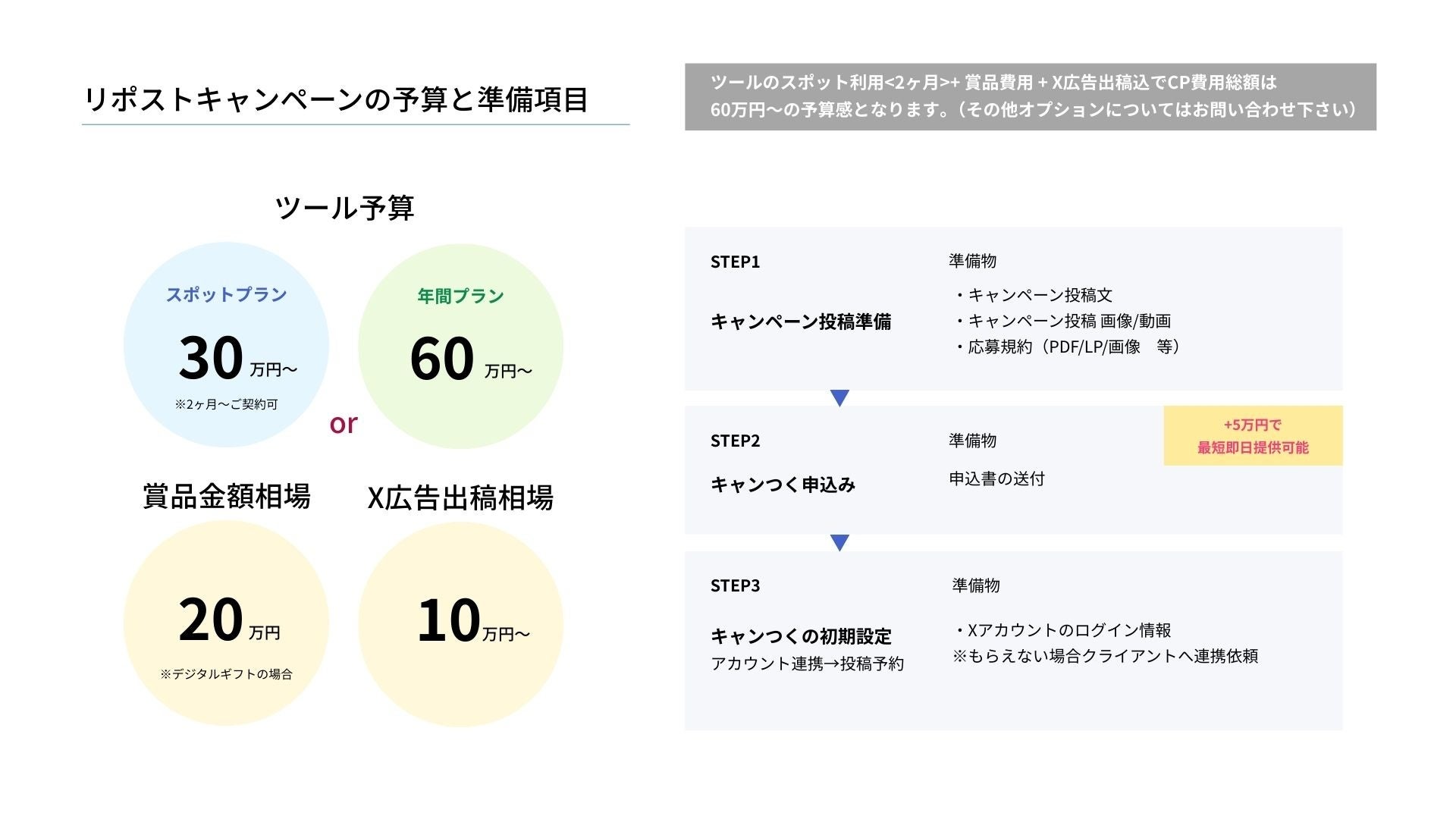 代理店・支援会社がクライアントにXキャンペーンを提案する際、「この事例っていくらでできるの?」「実施するなら何を準備したらいい?」といった質問に即座に答えられる資料となります。