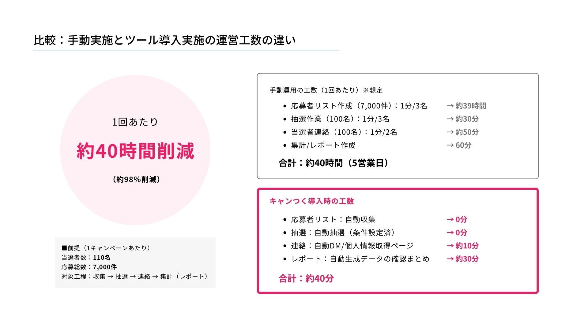 リポストキャンペーンとインスタントウィン(URL型)の費用相場、必要な準備項目、手動運用とツール利用時の工数比較(98%削減)など、クライアントへの提案時に必要な情報を簡易的にまとめています。