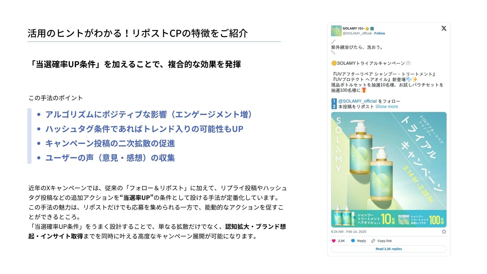 本資料は、Xキャンペーンの2大手法について、提案に必要な情報を網羅した構成となっています。