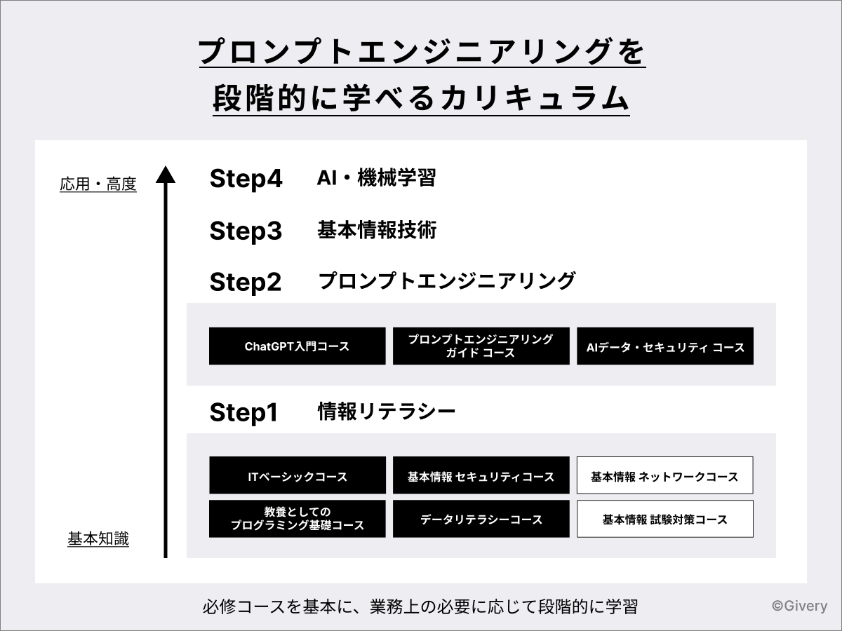 IT業界未経験、AI活用未経験の方でも業務の中で「法人GAI」を使いこなすための知識やスキルを効率的に習得することを目指した学習カリキュラムを構成しています。
