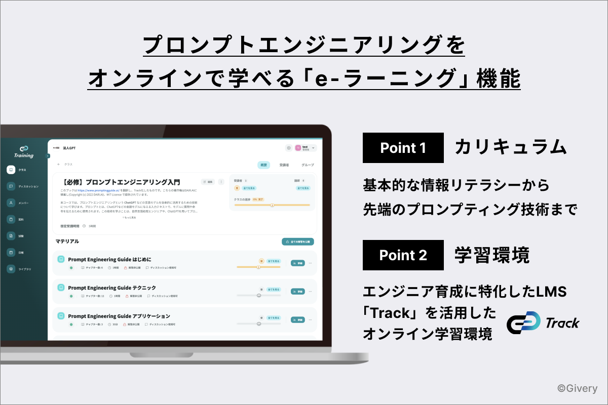 ギブリー、ChatGPT法人向けプラットフォーム「法人GAI」にて、プロンプトエンジニアリングをオンラインで学べる「e-ラーニング」機能を提供開始