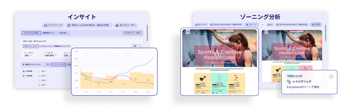 *2)セッションリプレイ:ウェブサイト上で来訪者の行動データ(クリックやホバーのほか、フラストレーションを示唆する動作など)を高精細に記録。事後にそのデータを画面に重ねて再構築することで、あたかもその来訪者の実際の操作を録画したかのように再生できるContentsquareの特徴的な機能です。お客さまが「なぜ」離脱したのかに答える示唆が得られます。