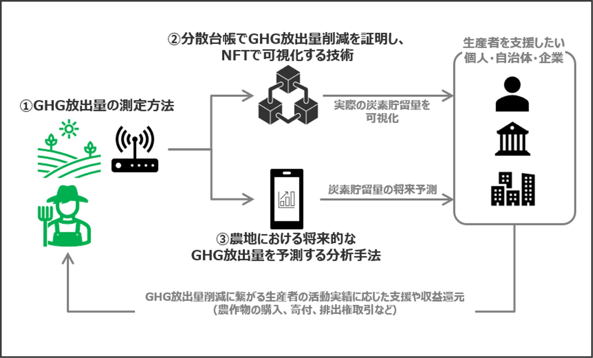 目的:正確なGHG放出量の測定とGHG放出量削減に貢献した生産者の活動実績のNFT化