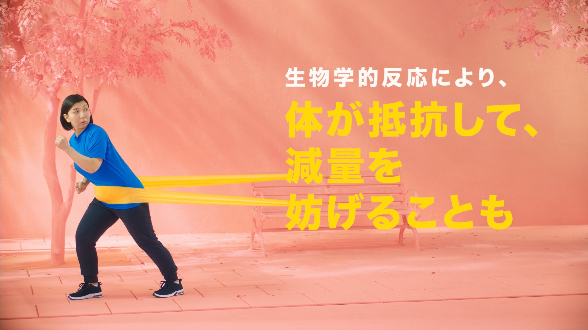 女性が黄色いバンドを懸命に引っ張るシーンでは、きちんと減量に取り組んでいるのに、体が抵抗する「生物学的反応」を視覚的に表現。人間には、体重が減ると「元の体重に戻そうとする体のはたらき」や、現在の状態を維持しようとして体が抵抗する「生物学的反応」が起こることがあり、減量した体重を維持することや、自身による生活習慣の改善だけで減量しようとしても難しい場合があります。そんなときは、自身による生活習慣の改善だけでなく、医療機関で正しい生活習慣の指導を受けたり、他の対処法について相談してみることができる、というメッセージを発信しています。