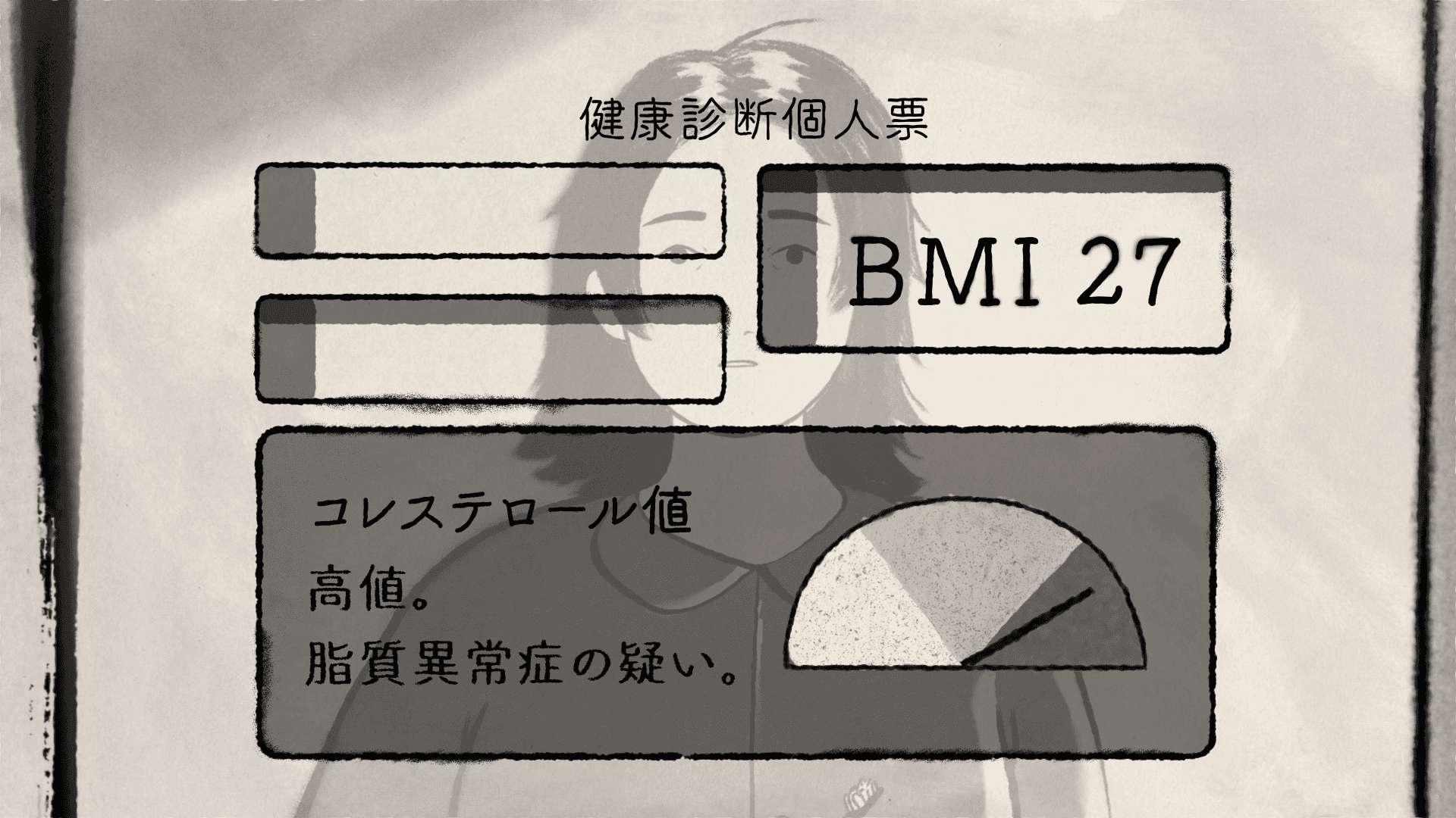 肥満症のある女性の心を描いたショートフィルムは、日々のストレスや不規則な生活、睡眠不足といった環境の変化により、これまで描いてきた「前向きな自分」が少しずつ揺らいでしまう、という一人の女性の「心の声」から始まります。健康診断でコレステロール値やBMIの変化を指摘され、生活も体も「描き直したい」と強く願い、懸命に前に進もうとする彼女。しかし体が減量を拒んでいるかのように引き戻され、身動きが取れなくなってしまいます。努力をしても減量や減量体重の維持といった結果が出ず、道を見失いかけた彼女の孤独と焦りを、線画アニメーションならではの繊細なタッチで表現しました。