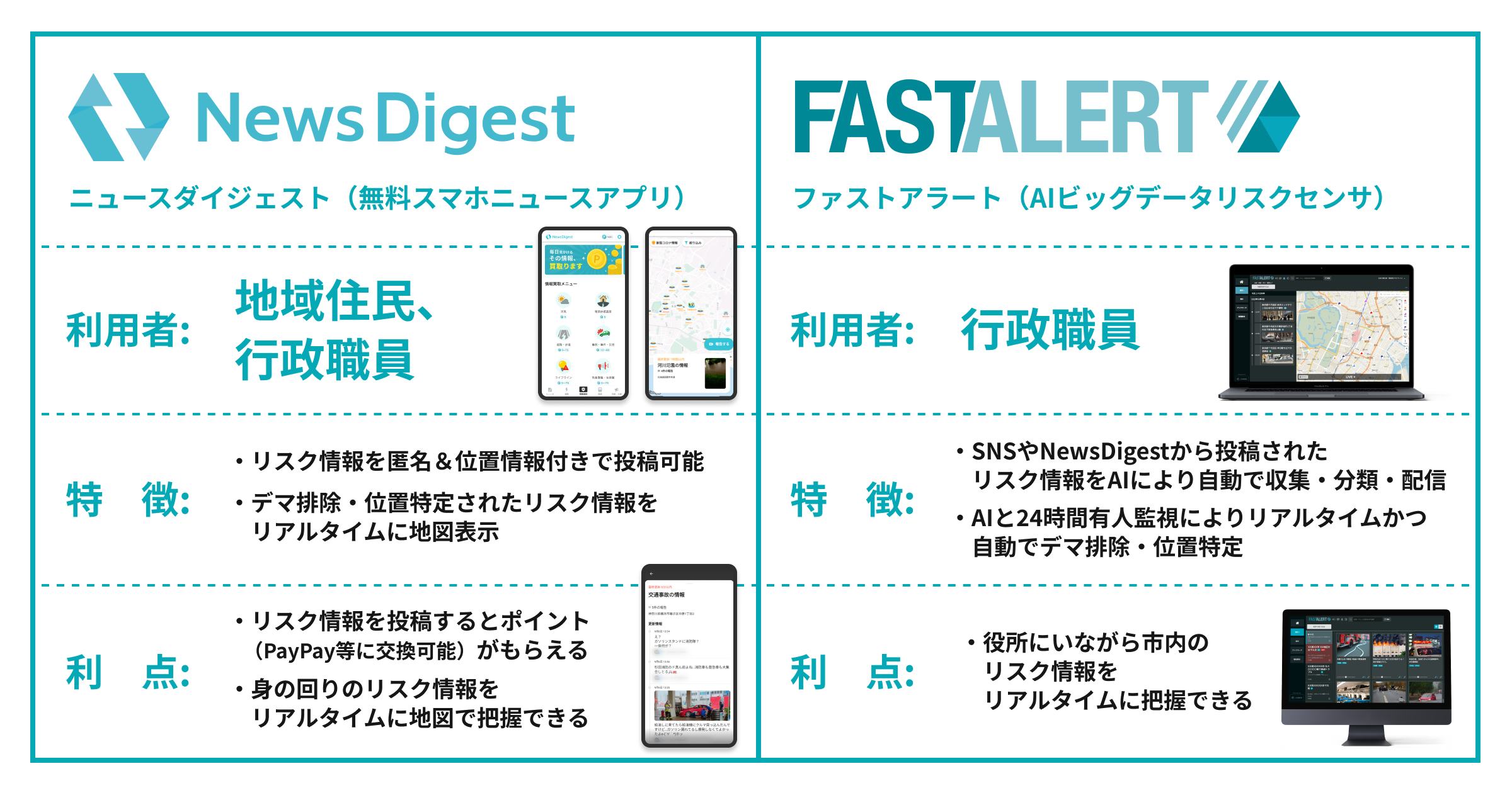 「FASTALERT」は、AI(人工知能)がSNSから災害、事故、事件などのリスク情報を収集し配信するWebサービスです。2016年9月のリリース後7ヶ月で、全ての⺠放キー局とNHKで採用。各局ニュース番組における「視聴者提供」動画定着の原動力になりました。2018年の日本新聞協会 技術開発奨励賞を受賞。 現在はビッグデータリスク情報SaaSとしてシェアNo.1の業界標準として、全国の大半のテレビ局や新聞社に採用されているほか、警察、消防、自治体、一般企業等でも幅広い導入実績があります。