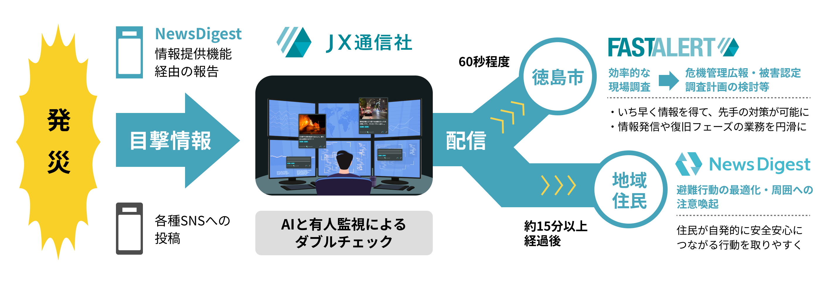 さらなる地域防災力の強化を目指し、地域同士、地域と行政とが協力しあって網羅的かつ即時に状況把握ができ、情報発信手段の多重化にもなりうる「NewsDigest」を、徳島市における地域防災力向上のための1つのソリューションとして利用推進していくとともに、徳島市のデジタル化推進に関する共同検討を実施していくこととなりました。