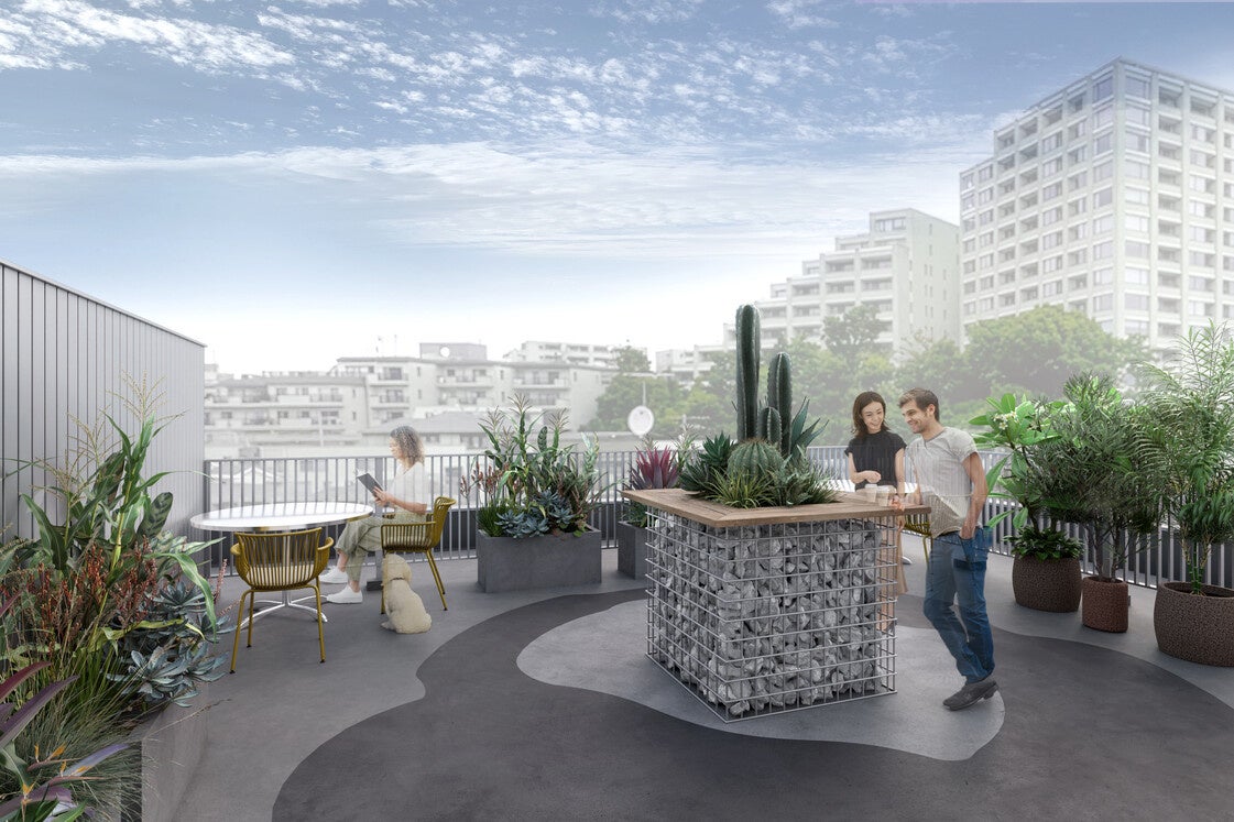 緑道を望む、開放的なルーフトップテラス。風や自然光を感じられる屋上空間として、中央に配したガビオンを囲みながら、自然な会話や新たな交流が生まれる、心地よい場となっています。