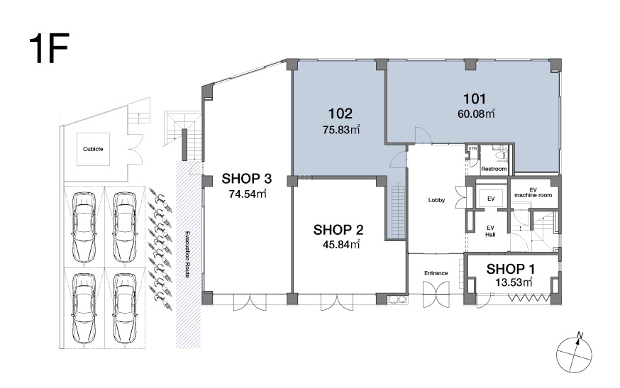 1Fならではのスムーズなアプローチと、天井高3.6mのゆとりある空間を活かしたショールーム兼オフィス区画。自社プロダクトの展示や商談、オープンなワークプレイスなど、企業の個性や利用目的に合わせた柔軟な運用に対応します。専用の地下フロアを備えた102区画は、1Fと地下を使い分けることで、撮影スタジオなど多様な用途での活用も可能です。