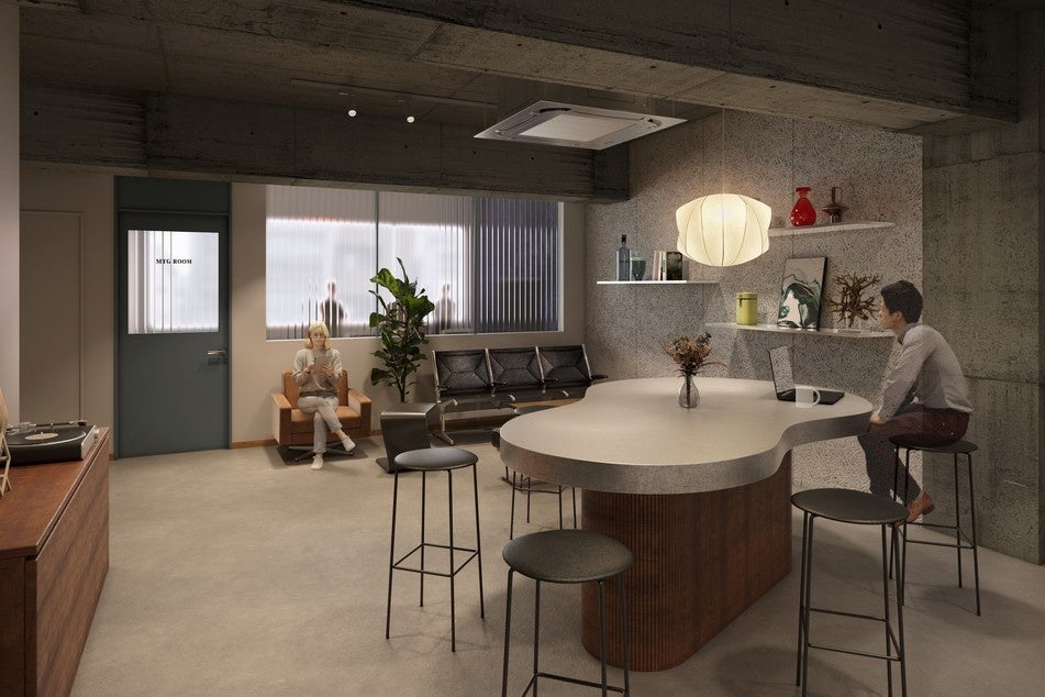 コーヒーを片手に一息つきながら、個人ワーク、チームでのブレスト、来客時の打合せなど、さまざまなシーンにフレキシブルに対応します。入居者同士が自然に交流できる設えとすることで、何気ない会話や偶然の出会いを育み、新たな発想やつながりを生み出す場となっています。