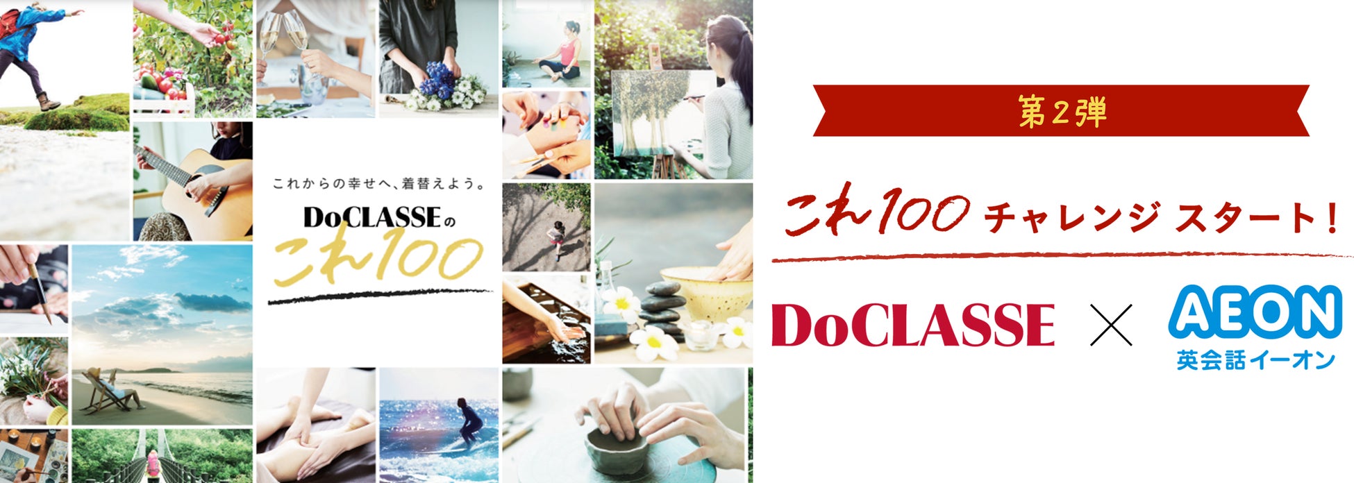 プロジェクト第二弾となる今回は、ファッションブランド「DoCLASSE」と英会話学習の「イーオン」がタッグを組み、 “今年こそ英語を話せるようになりたい”や“一生のうちに英語を話せるようになりたい” など、英会話に挑戦したいと思っている大人女性に向けた「これ100英会話チャレンジキャンペーン」をスタート。