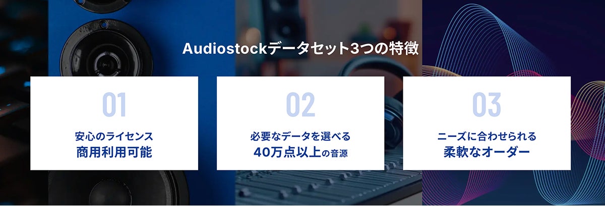 また、Audiostockで販売中の約40万点の音源の中から、ご要望に応じて音源データを選定しご提案する「カスタムセレクト」や、Audiostockに登録中の3万組以上のクリエイターから音源を募集する「オーダーメイド調達」といった従来の方法でも、音源データを提供してまいります。