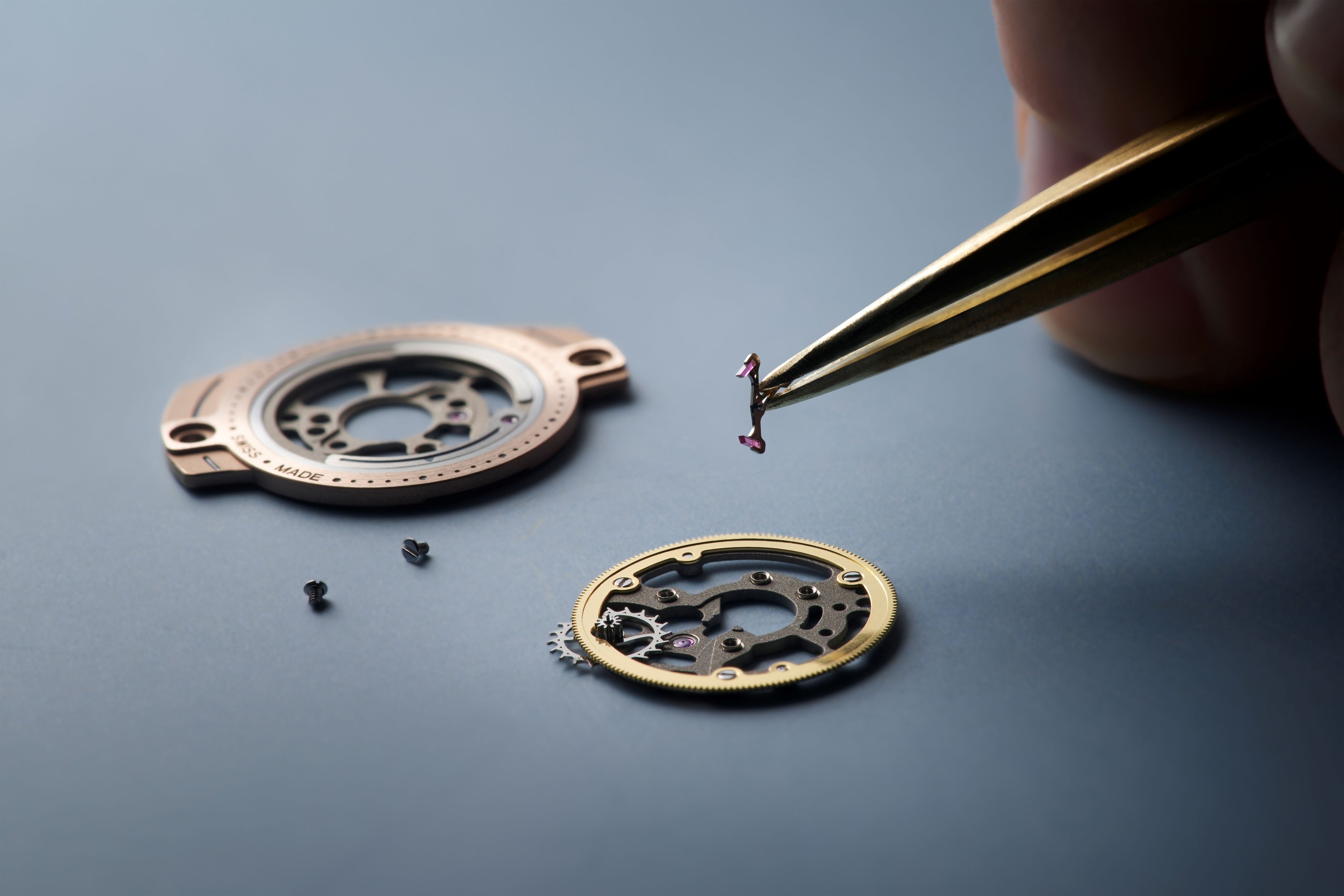 テンプのリムとサファイアクリスタルの厚みが共に0.2㎜のため、これらを製造する機械は約2ミクロン、つまり0.002㎜の精度を持たなければなりませんでした。その後の装飾的な表面加工の工程を考えると、この段階での精度はさらに重要になります。以前は6本だった歯車のアームの数は4本になっていますが、手作業で行われるダイヤモンド研磨と面取りの装飾の際に部品が変形しないように作る必要がありました。「アルティプラノ アルティメート コンセプト トゥールビヨン」は、さまざまな革新の集大成といえるでしょう。