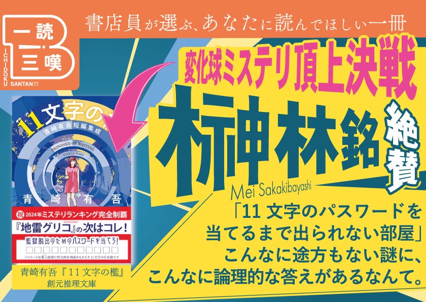書店の垣根を越えて集った選書のスペシャリストたちが、読者におすすめしたい本を選定する「一読三嘆」企画に、青崎有吾『11文字の檻』、榊林銘『あと十五秒で死ぬ』が選ばれました。