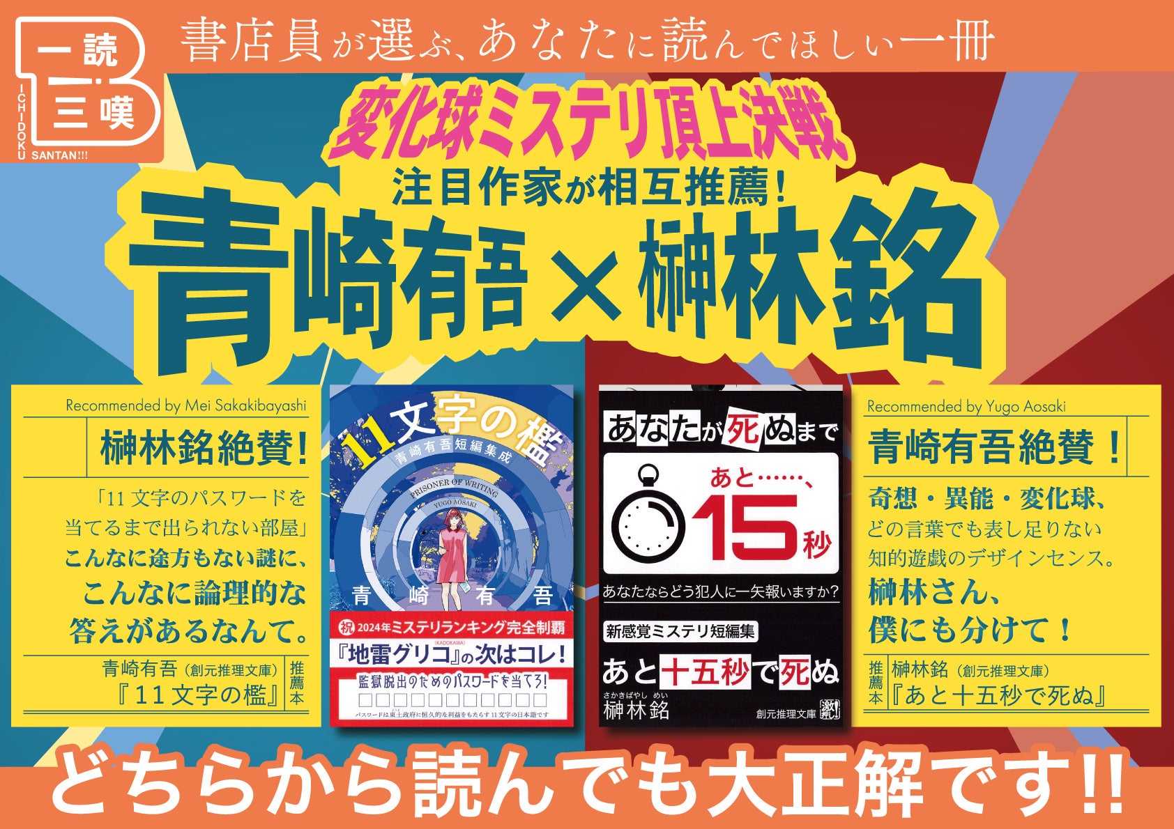 ○「一読三嘆」企画 『11文字の檻』『あと十五秒で死ぬ』(変化球ミステリ頂上決戦)展開書店・詳細はこちらから