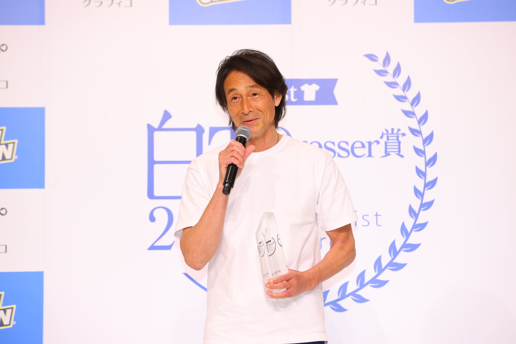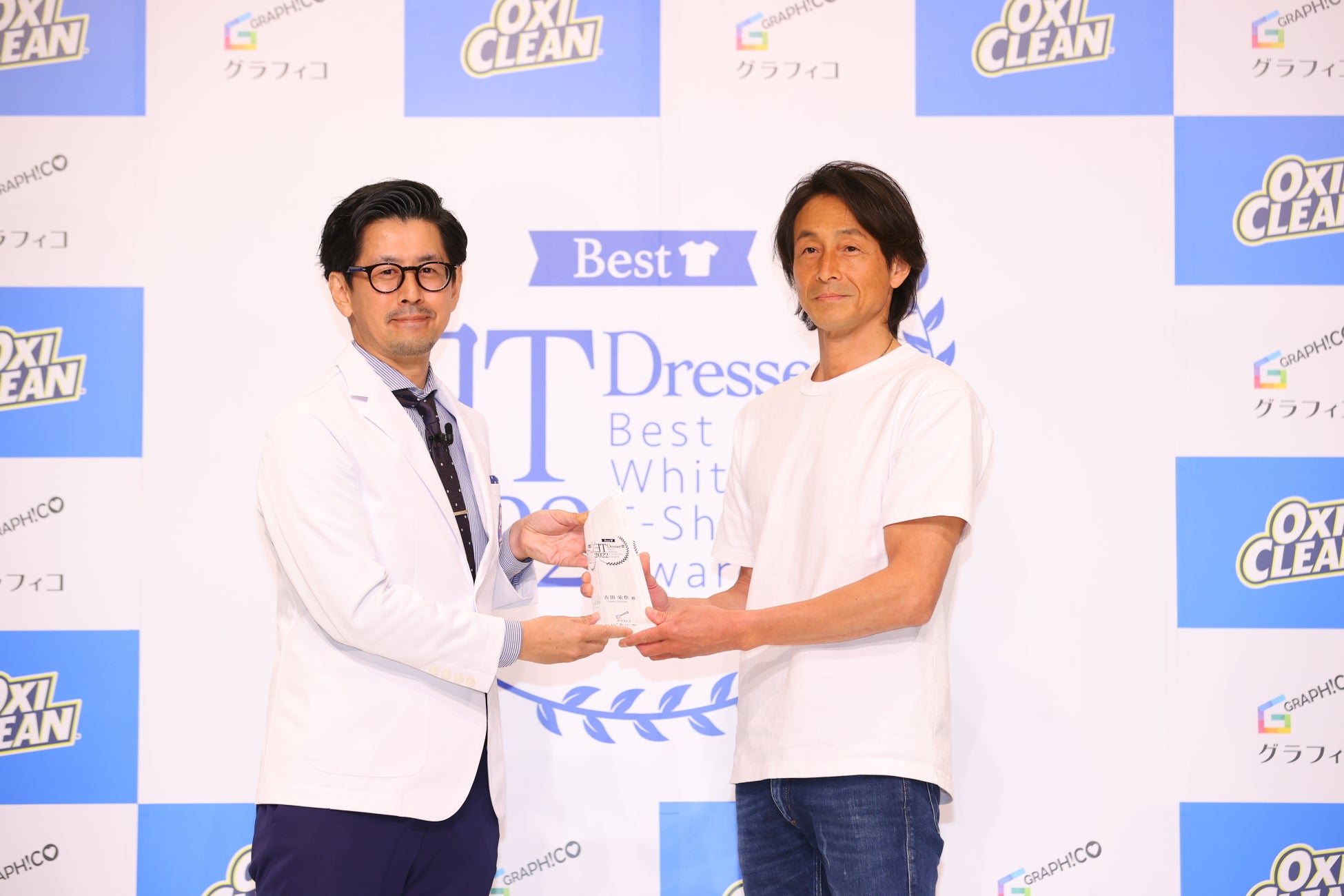 イベントでは、吉田栄作さん、河北麻友子さんが、この日のために開発された、特製白Tシャツを着て登場。授賞式で「ベスト白Tドレッサー賞」トロフィーを手渡され、受賞の感想について聞かれると、吉田さんは「どこまで白Tで引っ張るのかと自分で突っ込みたいところではありますが、栄えある第1回目ということで、ありがたく頂戴したいと思います。少年時代から白Tとブルージーンズが大好きで、愛し続けてよかったなと思います」と白T愛も語ってくださいました。