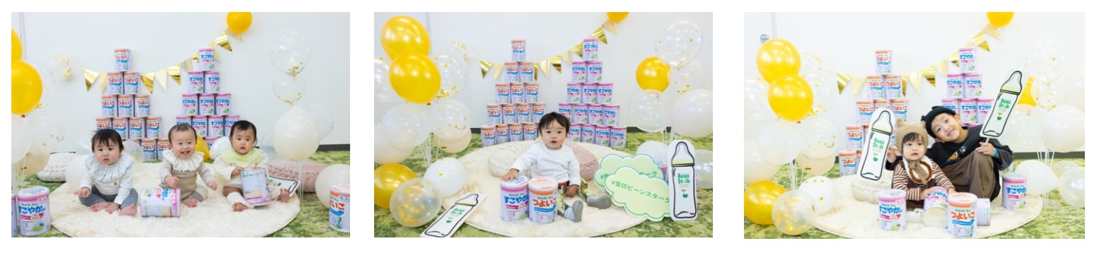 「すこやかM1」と「つよいこ」、ぷくちゃんのクリスマスパネルが展示され、ミルクの絵柄が入ったかわいいフリップを持ってカメラマンによる撮影会が行われました。家族でたくさんの笑顔ショットが撮影されていました。