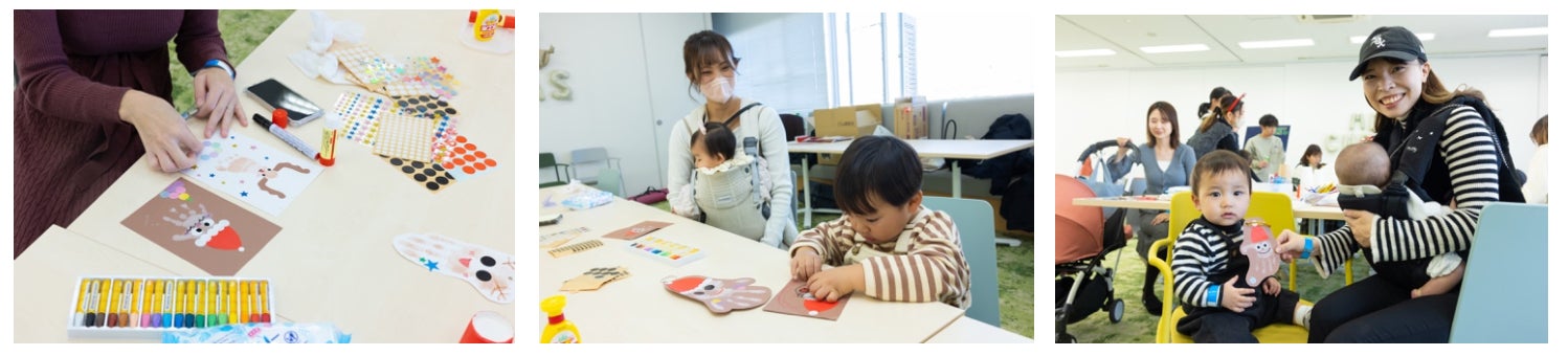 お子さまの手形足形でかわいいトナカイやサンタを作り、シールや紙コップ・クレヨンなどで、クリスマスツリー用のオーナメントや紙コップサンタさんなどをママやパパと一生懸命作る姿がみられました。
