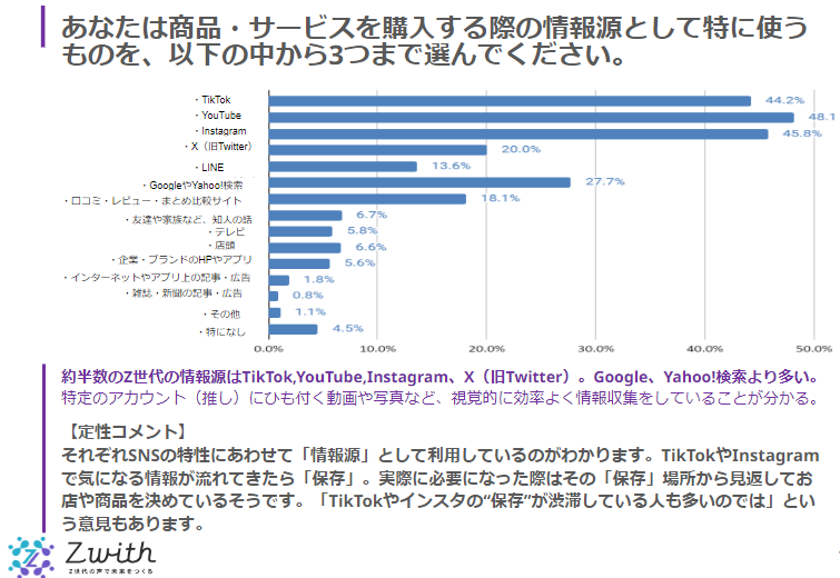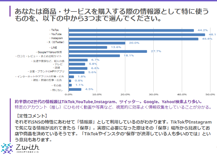 ◆約半数のZ世代の情報源はTikTok,YouTube,Instagram、X(旧Twitter)。Google、Yahoo!検索より多いことがわかった