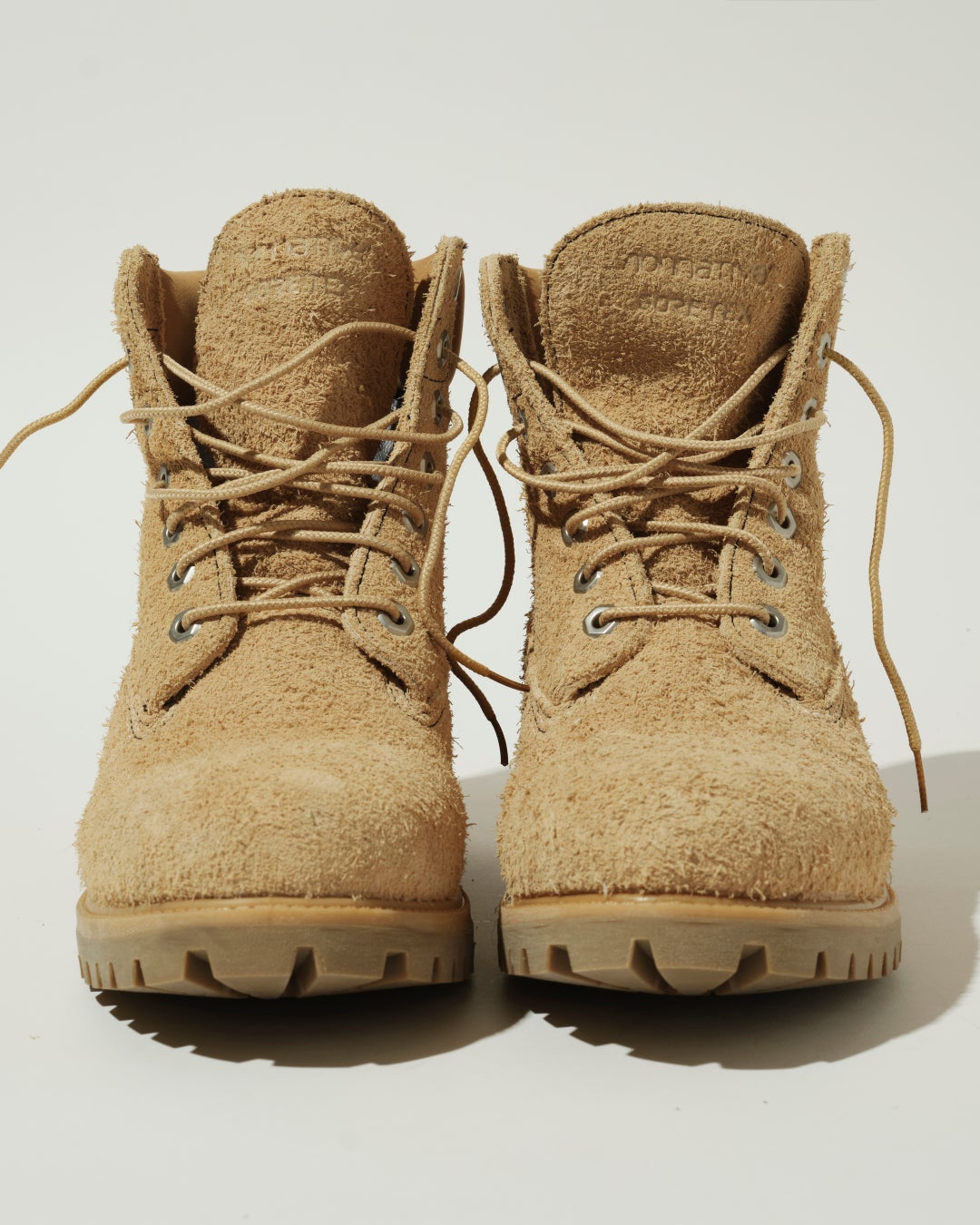 2017年よりリリースを続けてきたコラボレーションシューズ「6INCH PREMIUM BOOT VIBRAM GTX」が、更なるアップデートを施され新たなカラーで登場。〈Timberland〉のヘリテージを踏襲しつつ、nonnative が追求するデザイン性、機能性を追加して、モダンな一足へと昇華させたプレミアムブーツです。素材は、〈Timberland〉の基準を満たした高品質で毛足の長い防水スウェードレザーを採用。今回は、アメリカン・クラシックの雰囲気を漂わせるSAND BEIGE カラーを採用。ソールとマッチするように用意したこの企画だけのオリジナルカラーです。アクセントとなる白黒糸によるステッチは、本コラボレーションシリーズ独自のデザインエレメントとなっています。アッパー部分に〈GORE-TEX〉メンブレンを搭載することで、防水性と透湿性を備え、どんな天候下にも耐えられるタフな仕様。