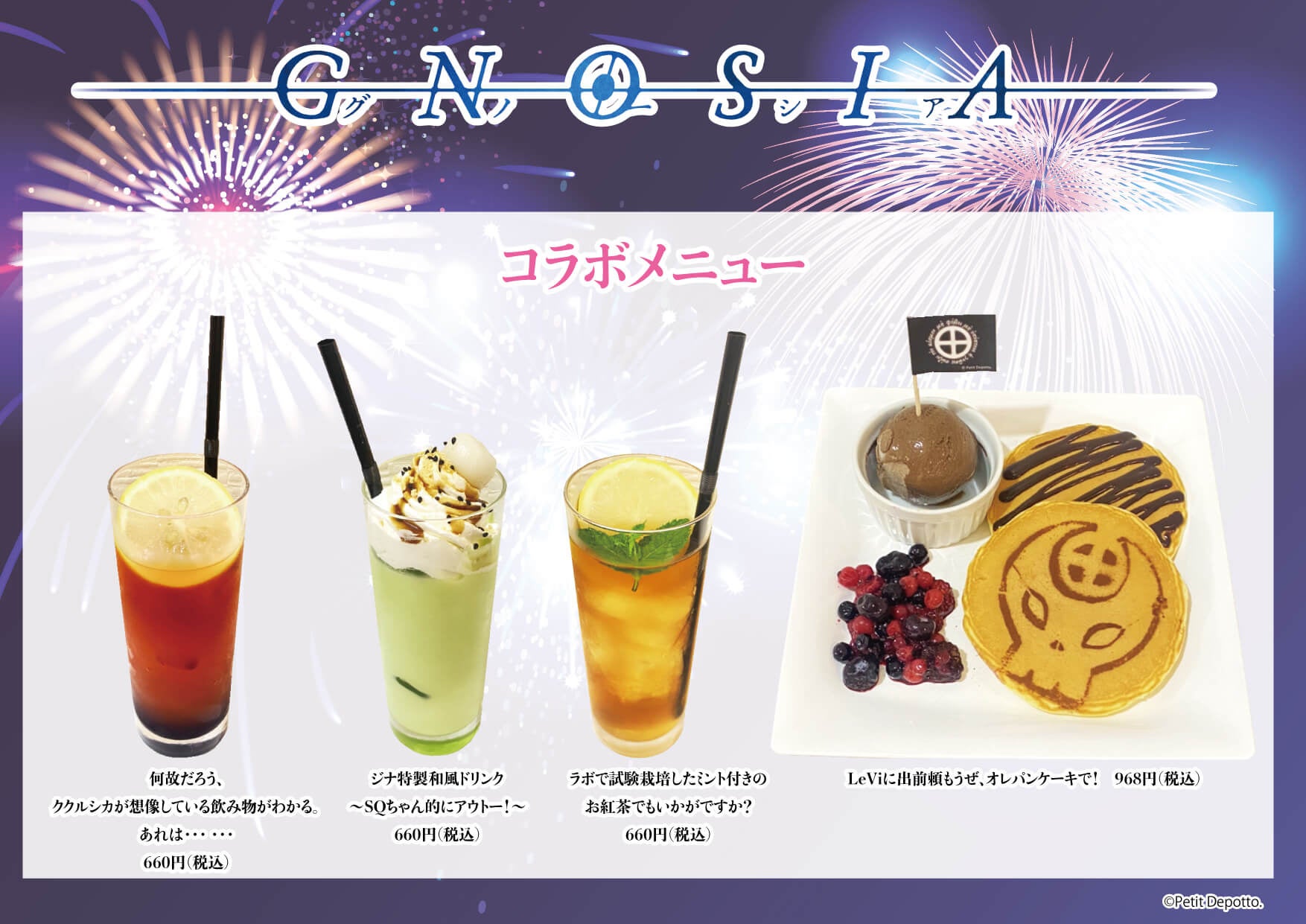 コラボカフェでは「何故だろう、ククルシカが想像している飲み物がわかる。あれは……」、「ジナ特性和風ドリンク~SQちゃん的にアウトー!~」、「ラボで試験栽培したミント付きのお紅茶でもいかがですか?」、「LeViに出前頼もうぜ、オレパンケーキで!」の4種類。