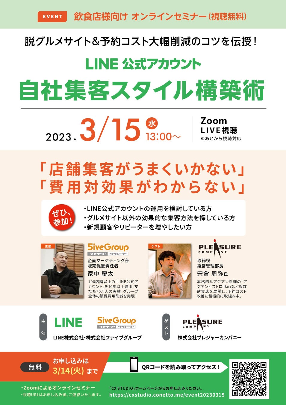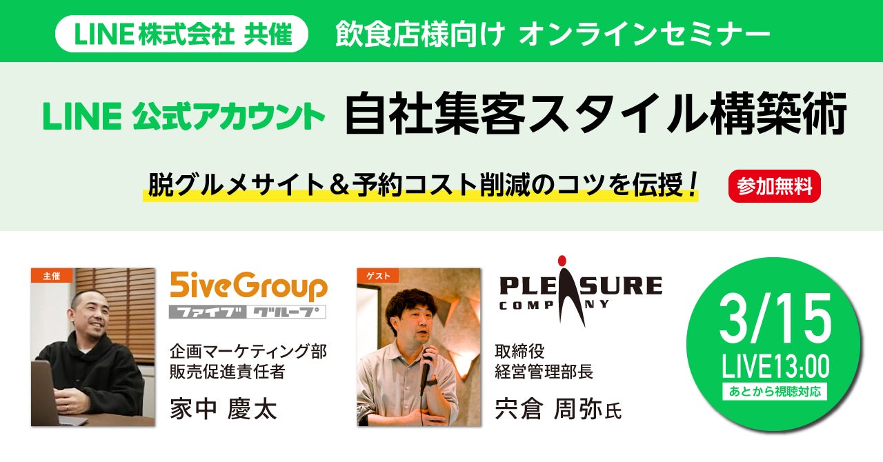 「"楽しい"でつながる世界をつくる」を経営理念とする飲食企業の株式会社ファイブグループ(本社:東京都武蔵野市 代表取締役社長:坂本憲史 以下ファイブグループ)は、2023年3月15日(水)にLINE株式会社と共催で、ゲストにアジアンビストロDaiを経営する株式会社プレジャーカンパニーを迎える無料オンラインセミナー「LINE公式アカウント 自社集客スタイル構築術」を開催します。