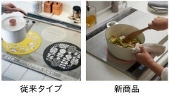 従来の売れ筋IHマットは、お鍋を置く部分のみを丸くカバーする不透明なタイプ。新商品はIHクッキングヒーター全体を広くカバーするため、油跳ねや、カバーとコンロのすき間汚れのお手入れが軽減できます。また全体をカバーしつつも、シートが半透明なので、お鍋の位置にも迷いなし!