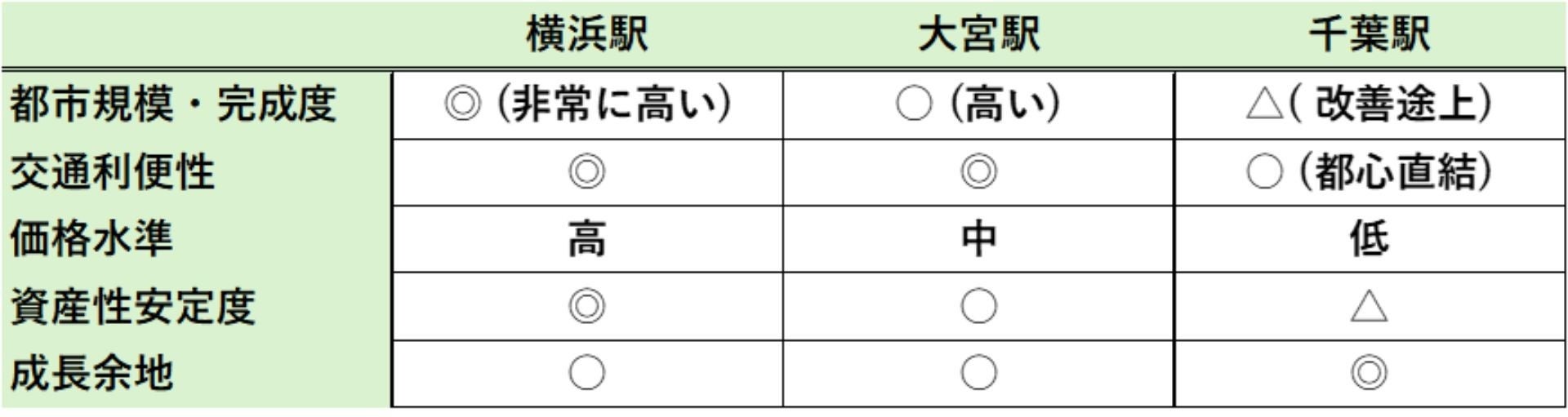 これらを一覧表で整理すると、横浜駅が総合力で非常に強いエリアに見えます。ただし、東京駅からの所要時間が同等という前提に立つと、大宮駅や千葉駅は価格水準が低いにもかかわらず、資産性が極端に劣るわけではありません。特に成長性や需給の安定性を考慮すれば、「相対的に割安」と評価することも可能です。