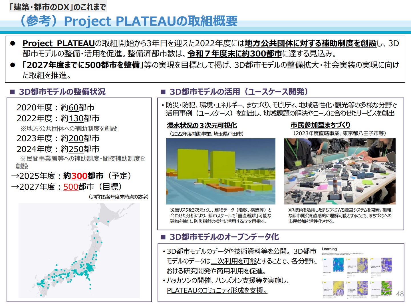 企業や自治体におけるXR・メタバース活用は、実証段階から実装段階へと進みつつあります。国土交通省は2026年3月公表の中長期ビジョンにおいて、デジタルツインを一過性のDXではなく、現実と連動し、継続的に使われる「日常業務等の基盤」として定着させていく必要性を示しています。Project PLATEAUにおいても、3D都市モデルの整備済都市数は2025年度末約300都市を予定し、2027年度には500都市を目標としています。