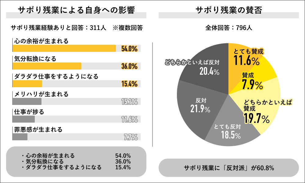 最後に、全体の60.7%が会社からの残業代が「出る」と回答し、39.1%の人がサボり残業をしたことが「ある」と回答しました。そして、全体の60.8%がサボり残業に「反対」を示している一方、サボリ残業による自身への影響は「心の余裕」や「気分転換」に繋がると回答した人が多数でした。