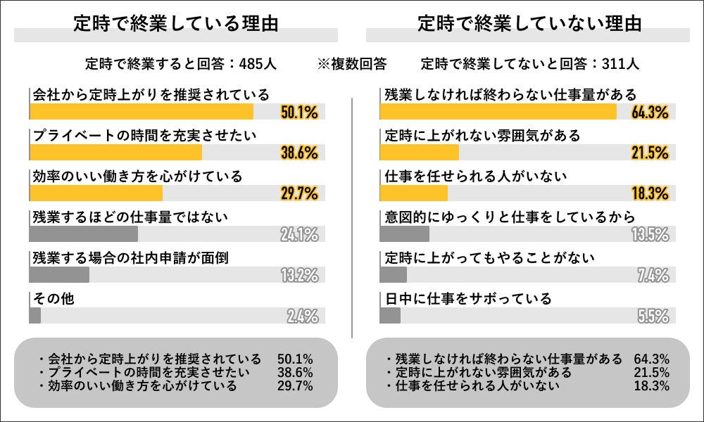 定時で終業すると回答した485人にその理由を聞くと「会社から定時上がりを推奨されている」が50.1%で最多となり、次いで「プライベートの時間を充実させたい」が38.6%、「効率のいい働き方を心がけている」が29.7%と上位3つの回答になりました。一方、定時で終業していないと回答した311人にその理由を聞くと「残業
