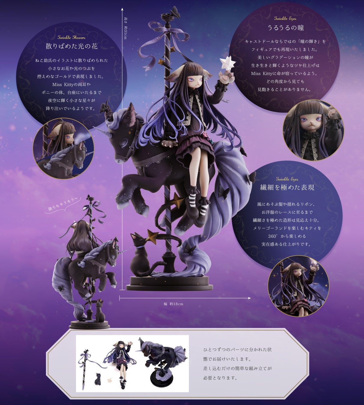 “夜空の下を優雅に闊歩する神秘的な黒猫”をテーマに、Dollzoneの大人気ドール「Miss Kitty」が新たな物語を纏った「Miss Kitty Twinkle Star」。