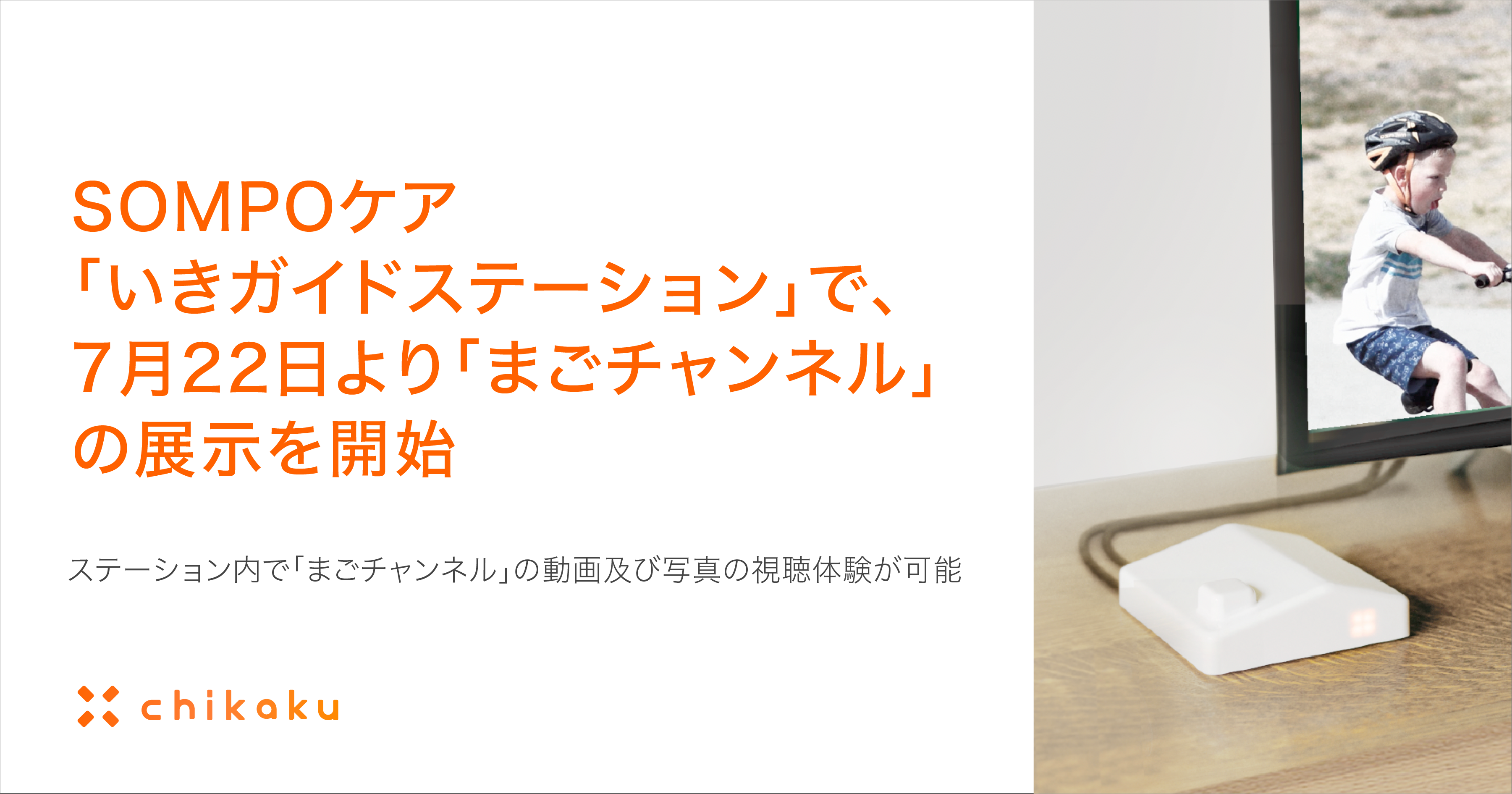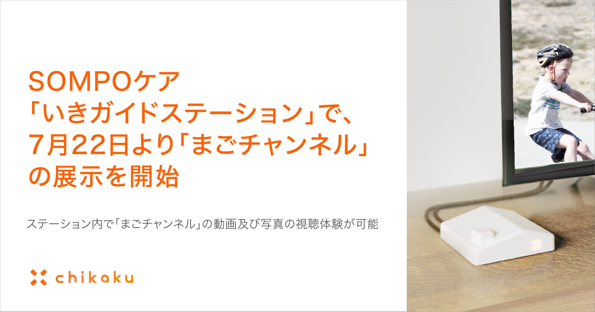 株式会社チカク(本社:東京都渋谷区、代表取締役:梶原健司、以下チカク)は、チカクが開発・販売するスマートフォンで撮影した動画や写真を実家のテレビに直接送ることができる「まごチャンネル」を、SOMPOケア株式会社(本社:東京都品川区、代表取締役社長:鷲見隆充、以下SOMPOケア)のサービス拠点「いきガイドステーション」(東京都世田谷区)にて、2022年7月22日より展示いたします。