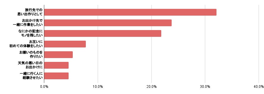 さらに、どんなシーンで上記のものづくりを体験したいかという問いには、「旅行先での思い出作りとして」が最も多く32.1%、続いて「お出かけ先で一緒に作業をしたい」が23.8%となりました。ものづくりをする体験時間そのものを、思い出に残る大切な時間と捉えていることが伺えます。続いて、3番目に多かった回答は「なにかの記念にモノを残したい」という結果になりました。体験後もモノが残るものづくりだからこそ、なにかの記念に体験したいという人が多くなっています。