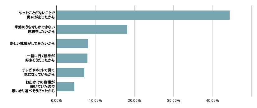 そとあそびの体験選びに重視するポイントを聞くと、「やったことがないことで興味があった」「新しい挑戦がしたい」という声が半数以上を占めました。