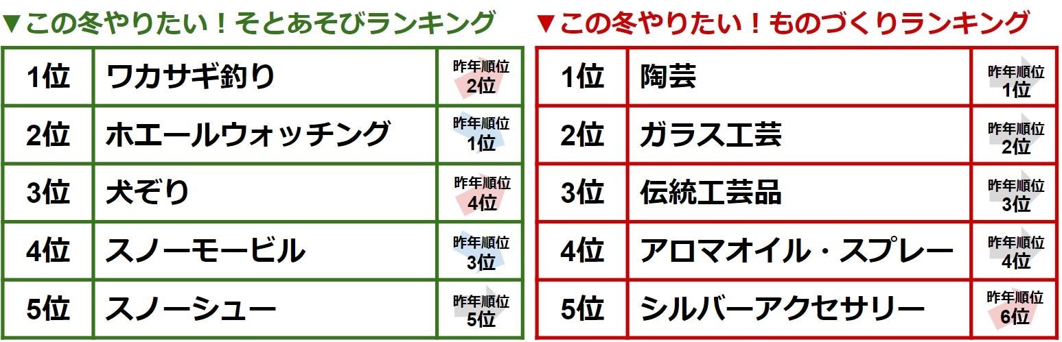 まもなく迎える冬休みシーズン。今回は冬の気候を体感できる「そとあそび」と、全天候型で寒さを気にせず遊ぶことのできる「ものづくり」、2つのジャンルで「この冬やりたいこと」に関するアンケートを実施しました。そとあそびの総合ランキング1位は昨年2位だった「ワカサギ釣り」、ものづくりの総合ランキング1位は昨年と変わらず「陶芸」が選ばれました。
