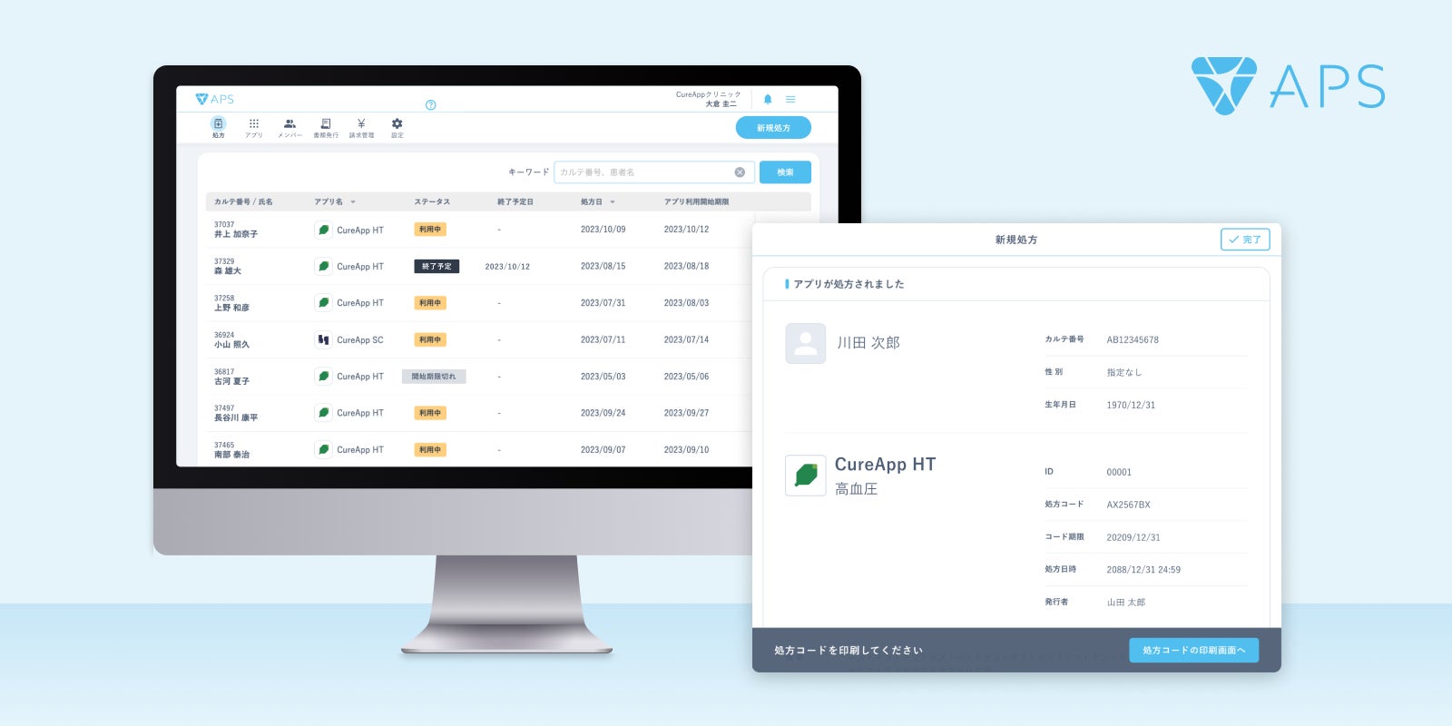 APSは医療機関がスムーズに治療アプリを処方できるよう開発された処方プラットフォームで、治療アプリの処方、利用状態の管理、代金回収、配送など治療アプリ処方に必要な各種運用を実行できます。 統一されたフローで処方・管理まで完結するので、医療機関の運用負荷を低減することができます。また、治療アプリ提供企業のセキュリティ体制を当社が確認するため、医療機関には安心してご処方いただけます。現時点では治療アプリの処方プラットフォームとしての機能がメインとなりますが、今後はさらに広く医療機関のデジタル技術の活用を支援するプラットフォームとなることを目指してまいります。