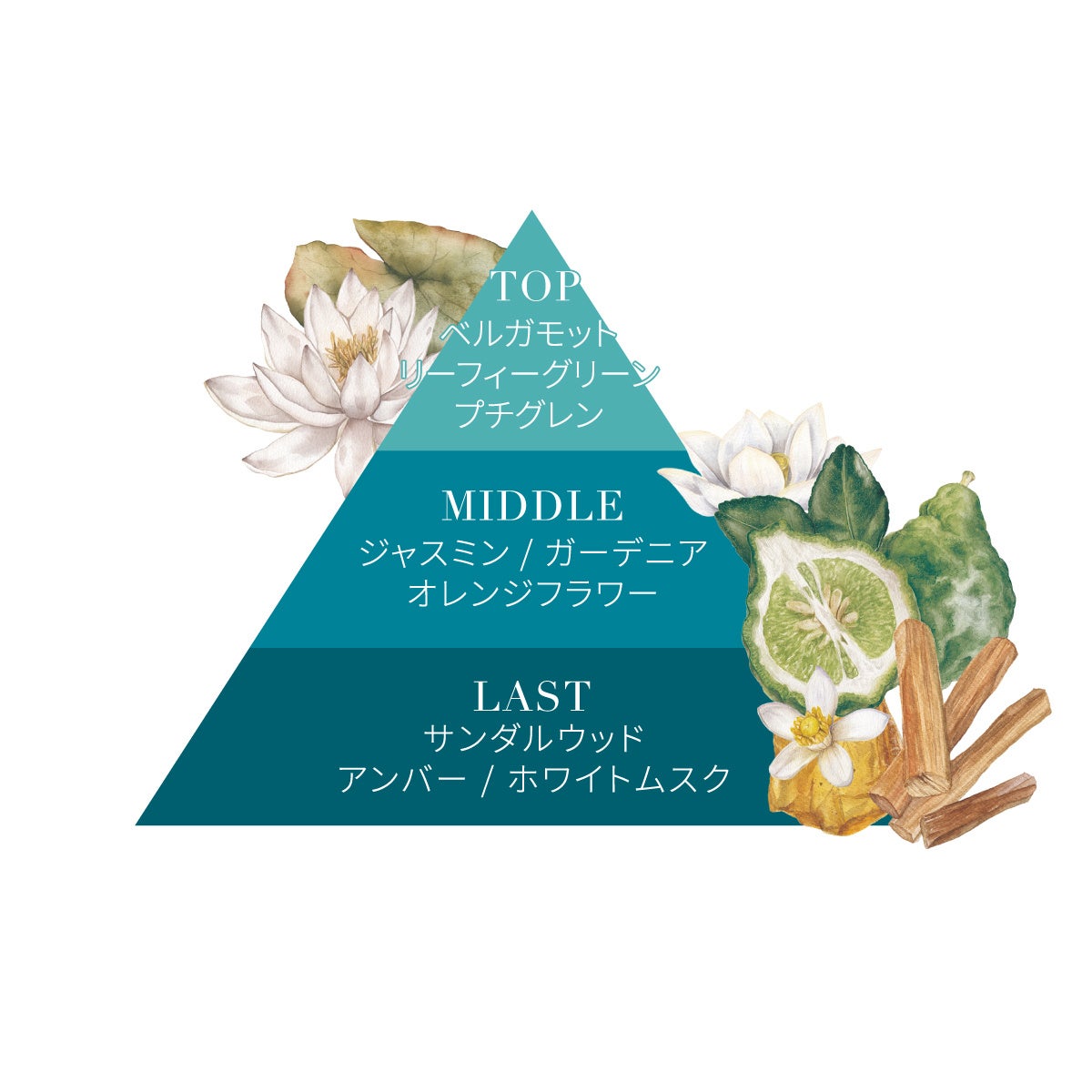 パッケージにあしらわれた睡蓮の葉のように、生花のような心地よいグリーン感が広がり、静けさと清らかさを感じる洗練された香りです。