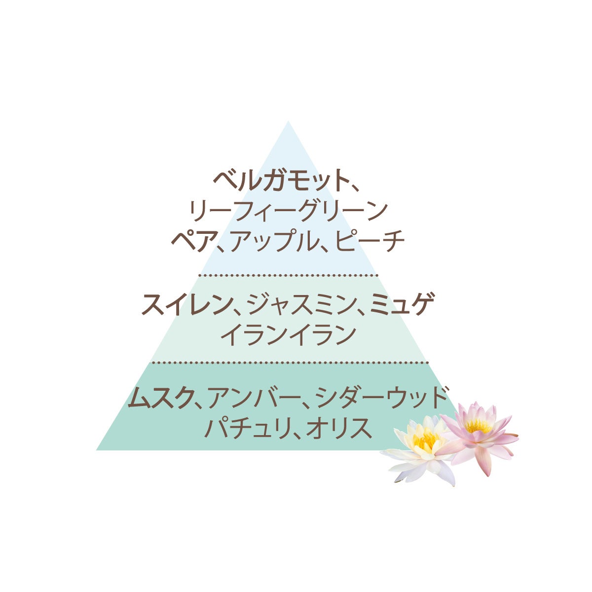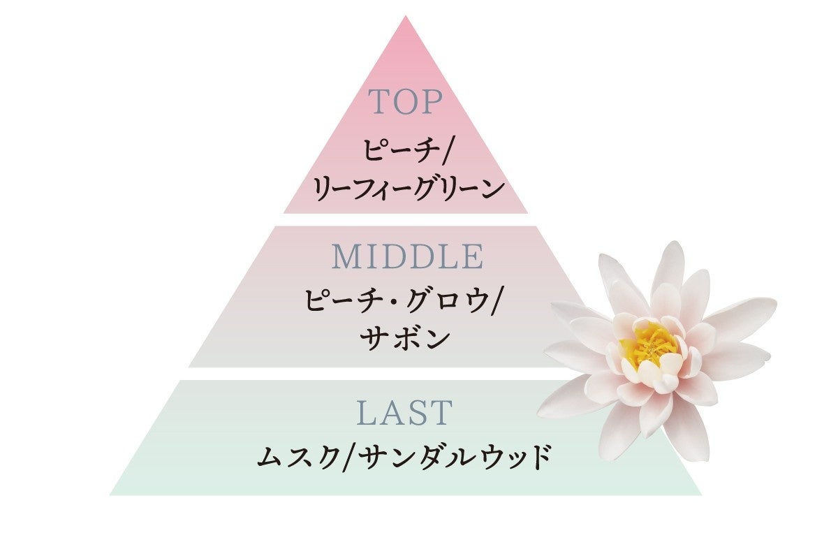 やさしいベルガモットのトップから、睡蓮とミュゲのフローラルが流れるように広がり、洗練されたムスクが全体を包み込みます。ひんやりクール処方※11により、シュッとひと吹きすると、冷たい水の流れを感じるような清涼感をお楽しみいただけます。