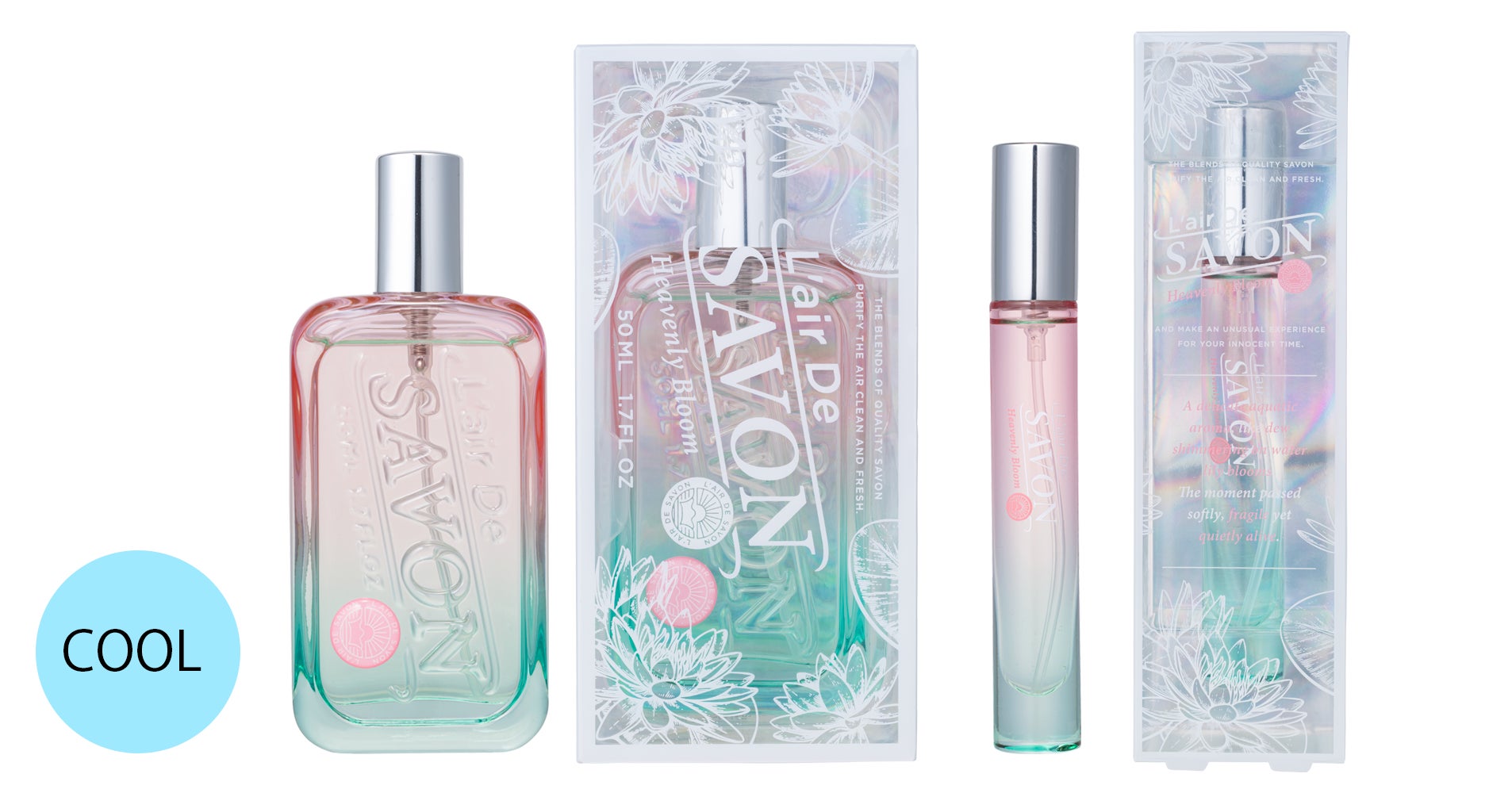 睡蓮が咲くみずみずしい情景をパッケージやボトルにも反映。パステルカラーと透け感が織りなす佇まいは、そこに在るだけで軽やかな涼を運びます。