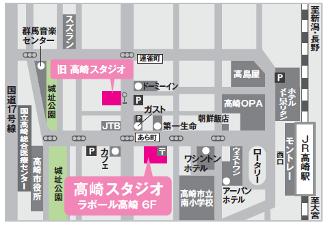 アクセス:高崎駅西口のロータリーから直進。大通り(シンフォニーロード)を進み、左手に「日本旅行」があるビルの6階にあります。