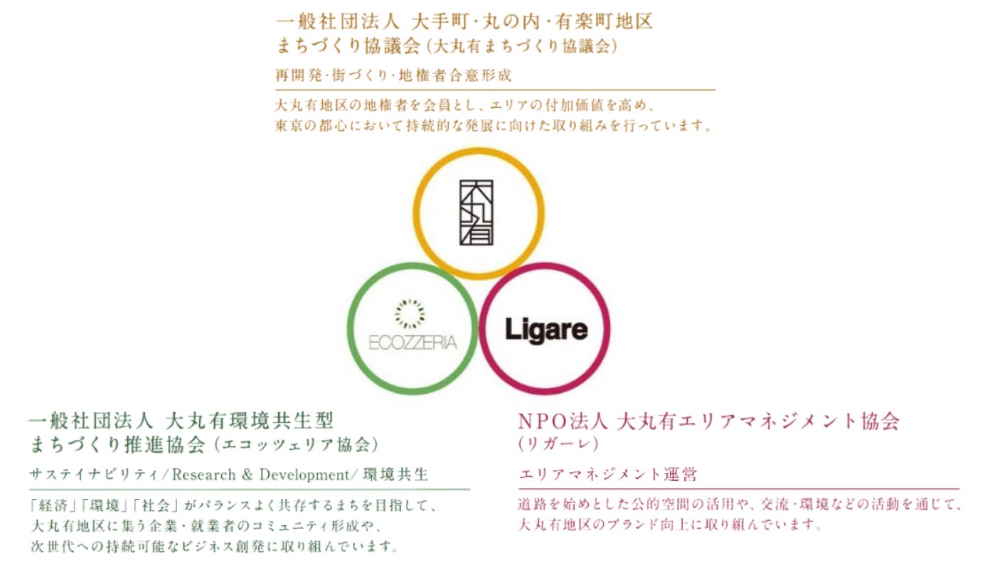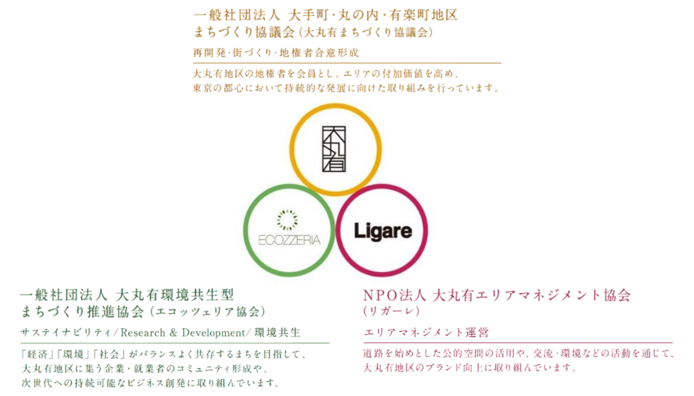 大丸有まちづくり協議会を中心に公民でまちの将来像を合意し、リガーレが賑わいや都市観光を促進、エコッツェリア協会が社会課題の解決や企業連携によるビジネス創発を具体化しています。